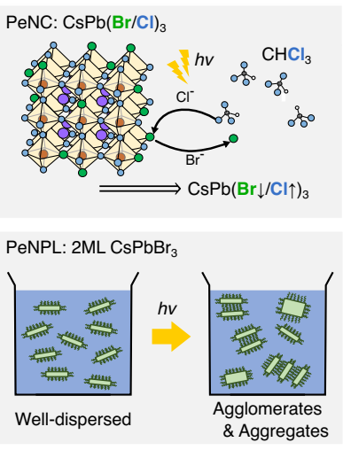 페로브스카이트 나노결정 빛과 반응하며 일어나는 반응 2가지. 연구팀은 나노결정 내부의 브롬(Br)이 염소(Cl)로 치환되는 과정(위)과 얇은 판 모양의 페로브스카이트 나노결정이 빛을 받아 응집하는 과정(아래)을 정밀 분석하는 데 성공했다. IBS 제공
