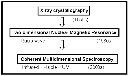 Two of the most incisive protein structure determination tools are (a) X-ray diffraction method and (b) two-dimensional NMR spectroscopy. History of the former technique, X-ray crystallography, goes back in 1950s and the latter, 2D-NMR for the purpose of structural analysis of proteins, has become widely used since 1980s. These two methods have both advantages and disadvantages (see Table 1). Although the X-ray crystallography can provide most definite information on 3D structure of a given protein, a crystalline sample has to be prepared. In strong contrast, the 2D NMR spectroscopy can be used to study 3D structure of a protein in solution by measuring nuclear Overhauser enhancement (NOE) effect or by measuring spin-spin coupling constants. However, the relative accuracy of 3D structure determined by the 2D-NMR is less reliable in comparison to the X-ray crystallography. One of the critical limitations of these two methods, X-ray crystallography and 2D-NMR, is that they cannot be used to study fast dynamics and conformational transitions of which time scales are less than miliseconds. For instance, protein folding time scale ranges from picoseconds to seconds, but the time-resolved 2D-NMR doesn’t provide any dynamical information on the folding process occuring less than a few miliseconds. Consequently, a number of researchers have been vigorously searching for an alternative experimental tool that can provide information on not only 3D structures but also dynamical evolution of their structures.