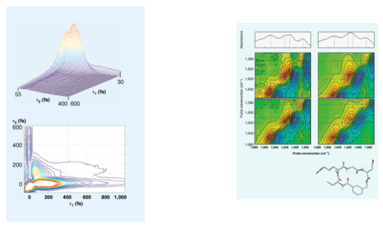Another class of 2D vibrational spectroscopies based on the IR four-wave-mixing scheme was used by Hochstrasser and coworkers at University of Pennsylvania in 1998.55 In particular, the time- and frequency-resolved IR pump-probe measurements of small polypeptides (2D spectra of cyclic pentapeptide are shown on the right) were performed by his group and the amide I vibrational exciton band was observed. Although, at that time, those experimental results were novel and highly interesting, interpretation of the results was not an easy task because there was no good theoretical model quantitatively describing local amide I mode frequencies and vibrational coupling constants. However, they were able to successfully show that the 2D IR pump-probe and photon echo spectroscopies can be a potentially useful method in studying 3D structures of polypeptides in solutions. It was also noted that these IR-FWM spectroscopic methods are highly analogous to the 2D-COSY NMR spectroscopy.