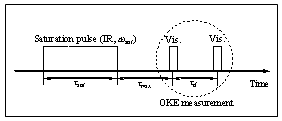 (a) The IR-OKE (IR optical Kerr effect) method was designed to study vibrational energy relaxation from a specific mode, which is excited by a long and intense IR pulse, to solvent bath modes. As demonstrated by numerous workers over the last decade, the optical Kerr effect measurement was found to be an exceptionally useful method for studying intermolecular vibrational dynamics of neat liquids. In particular, the low frequency (less than a few hundreds wavenumber) liquid vibrations can only be studied by the OKE method with a high accuracy. The excess vibrational energy accumulated on a specific mode that is in resonance with the frequency of the saturation IR pulse (see the above figure on the schematic pulse configuration) will dissipate into the solvent modes that are intermolecular in nature. Therefore, by measuring difference between the OKE signal in the presence of the saturation pulse and that in the absence of the saturation pulse as a function of mixing time (tmix), one can elucidate detailed mechanisms and pathways of vibrational energy relaxation process in condensed phases.