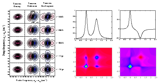 (b) 2-D Fourier deconvolution theory: In collaboration with experimentalists, Fleming and his coworkers at Berkeley, we developed an analytical Fourier deconvolution procedure for homodyne detected electronically non-resonant fifth-order signal that reveals the bare nuclear response function free from the influence of the electronic (hyperpolarizability) responses generated by the five potentially overlapping finite duration pulses used in the experiment. The potential implementation problems with the homodyne deconvolution procedure were evaluated through comparison of the third-order homodyne deconvolution result with that of the well-known third-order heterodyne deconvolution. Then, the homodyne deconvolution is extended to fifth-order where it is used on several measured tensor elements of the direct fifth-order signal. Suggestions were given for improving implementation of the procedure in fifth order so that more information on the direct fifth-order nuclear response as well as the hyperpolarizability responses can be recovered via the deconvolution procedure.