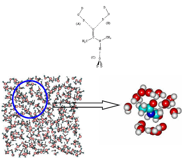 (a) Mono-peptide: The prototype peptide molecule is N-methylacetamide (NMA). For a number of NMA-(D2O)n (n=1~5) clusters, we have carried out extensive