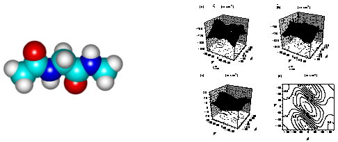 (c) Tripeptides: Tripeptide contains a single peptide surrounded by two peptide groups so that it serves as the smallest and simplest model for studying proteins. As can be seen in the following figure, two pairs of dihedral angles determine the 3D tripeptide conformation. For seven representative conformations, i.e., right-handed a-helix (f = 57, y = -47), 310-helix (-49, -26), left-handed a-helix (60, 60), p-helix (-57, -70), parallel b-sheet (-119, 113), anti-parallel b-sheet (-139, 135), and fully extended b-sheet (180, 180), numerically predicted vibrational spectra were obtained and compared with experiments.80 Furthermore, site-specific isotope (13C or sup>13C18O) labeling effects on amide I infrared absorption spectra were theoretically described and their relationships with 3D conformation were elucidated.