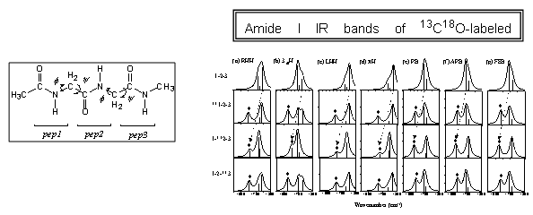 (d) Polypeptides: Varying the number of amino acid residues from 2 to 5, the local amide I mode frequencies and vibrational coupling constants were obtained by using both quantum chemistry calculation method and Hessian matrix reconstruction method, where the latter was recently developed by the CMDS.81 Astonishing results found through this series of investigation are (1) the vibrational coupling constants between two nearest neighboring peptides are strongly dependent on 3D polypeptide conformation, (2) however, they are not sensitively dependent on the chain length, and (3) the local amide I mode frequencies are highly site-dependent, meaning that the local flexibility information can be obtained by the site-specific isotope exchange experiment.