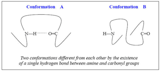 Noting that the secondary and tertiary structures of proteins are stabilized via various intra- and intermolecular interactions such as hydrogen-bond, electrostatic interaction, van der Waals interaction, hydrophobic interaction etc., one can extract vital information on the 3D polypeptide structure from vibrational couplings specifically depending on these interactions. For instance, the carbonyl oxygen and hydrogen atom in N-H group can form a single hydrogen bond, which is found in a- helix or pleated b-sheet polypeptides. Suppose that the structure of a given protein is likely to be one of the two conformations shown in the following figure below. A critical difference between the A- and B-conformations is the very presence of a specific hydrogen bond. If there is a hydrogen bond between amine and carbonyl groups as can be seen in the A-conformation, the amide I mode, which is the C=O stretching mode (with frequency of wI), can be strongly coupled to the amide III mode (with frequency of wIII), which is the N-H bending mode. Therefore, the cross-peak intensity in the case of conformation A is likely to be larger than that of the conformation B. In reverse, if there is a relatively strong cross-peak at (wI and wIII) in a given 2D vibrational spectrum, one can assume that the correct structure is A rather than B. Of course, there are other localized amide I and III modes in a polypeptide so that the 2D vibrational spectrum would again be spectrally congested so that one might not be able to selectively measure this cross peak. However, introducing isotopes such as 13C, 18O, and D (deuterium) for the two target modes and using doubly vibrationally resonant enhancement effect of the IR-IR-vis four-wave-mixing spectroscopy, it will be experimentally feasible to measure the absolute intensity of this cross peak.